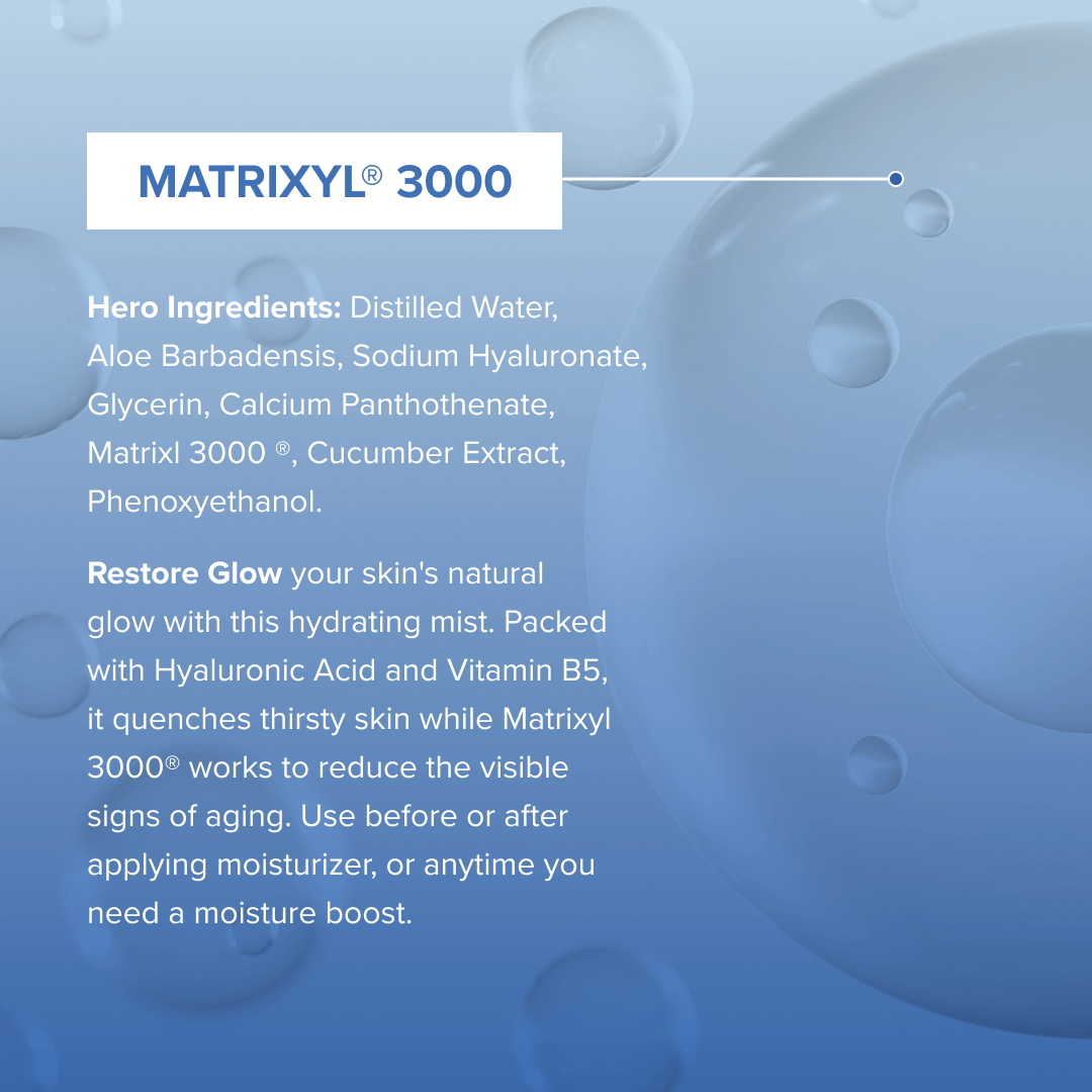 Nurture and rejuvenate your skin with our Restore Hydrating Peptide Spray, formulated to hydrate and heal with the added benefits of Vitamin B5. This rich formula works to repair and restore your skin’s natural barrier while infusing it with moisture. Enhanced with Matrixyl, it smooths fine lines and promotes collagen production for a firmer, youthful complexion. Perfect for skin that needs extra care, this spray delivers deep hydration and helps rejuvenate your skin, leaving it soft, smooth, and visibly nourished.